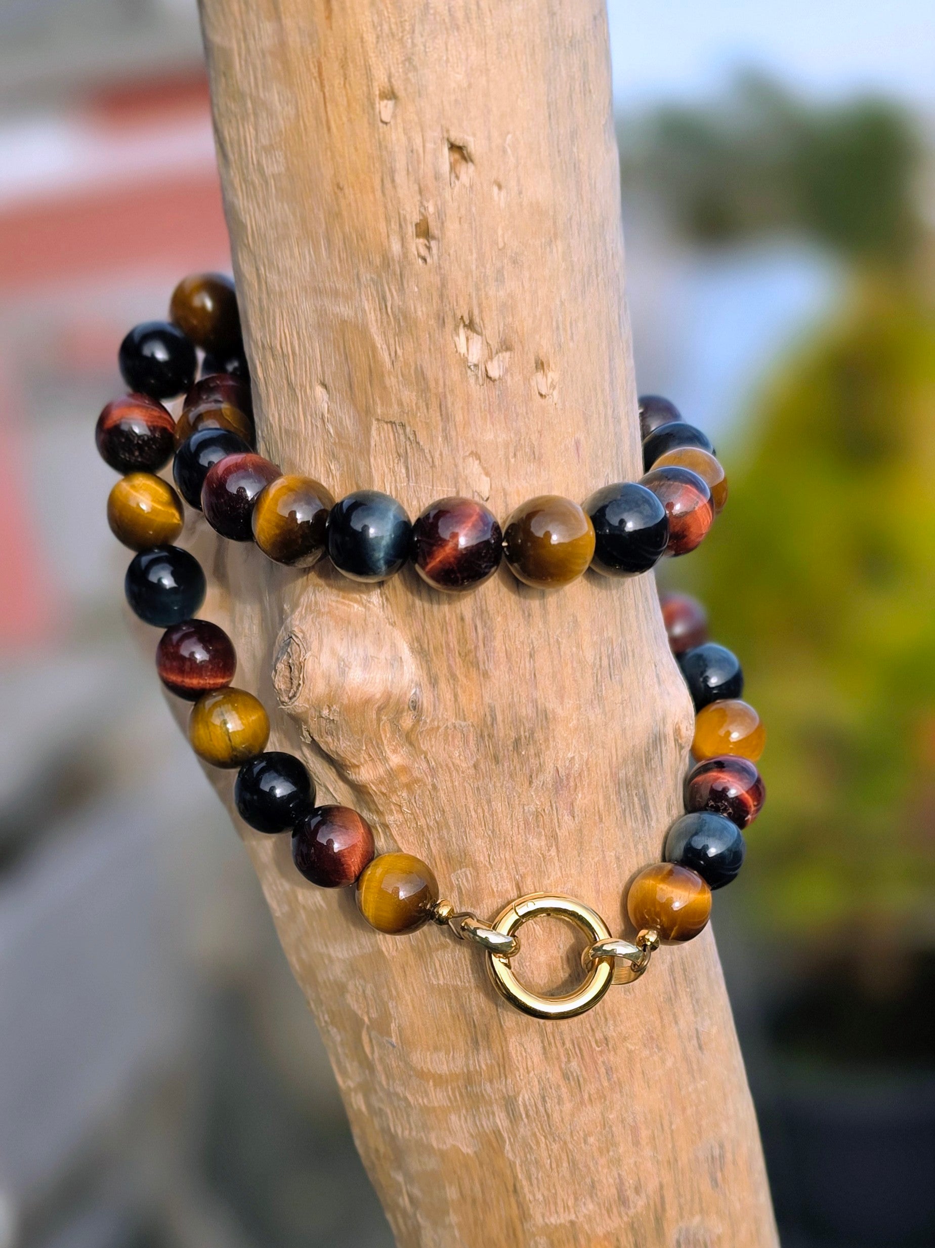 Ce collier artisanal, composé d'un mélange d'Œil de Tigre, Œil de Taureau et Œil de Faucon, est une alliance puissante pour l'ancrage, la confiance et la vision intérieure.